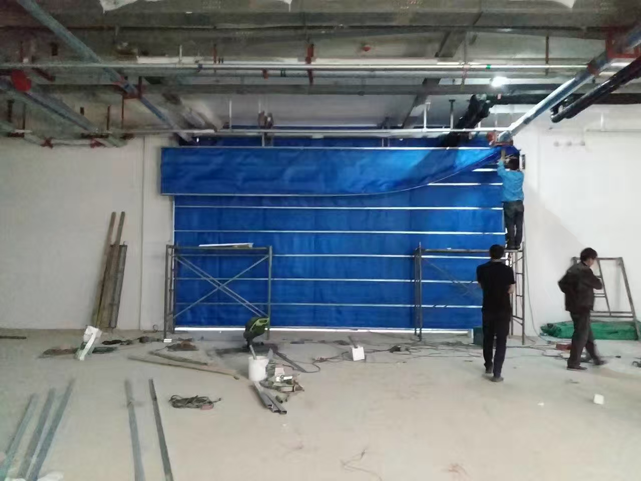 无机纤维材料做帘面,用钢质材料做夹板、导轨、座板、门楣、箱体等,并配以卷门机和控制箱所组成的能符合耐火完整性要求的卷帘。
