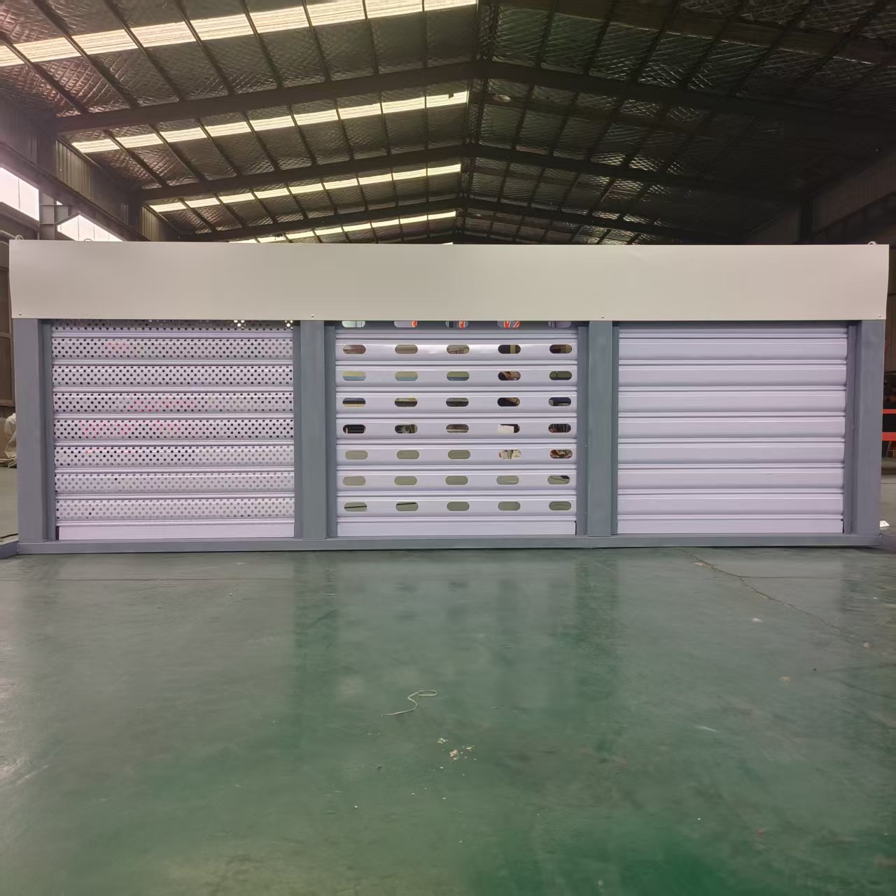 门体采用镀锌钢板、不锈钢板或彩钢板经冷轧成型,导轨内置抗风钩结构防止帘片脱轨。核心抗风强度达784.5Pa,可抵御12级台风,最大规格覆盖高12米、宽20米 。集成防撬、防尘、隔音、保温等复合功能,底部密封条与铝合金轨道增强耐用性。支持电动、手动及遥控操作,适配斜坡或转角场地安装,启闭速度为2-9米/分钟,电源适配220-380V/50Hz。相较于传统卷帘门,其抗风钩设计解决了帘片易吹脱、地槽易堵等问题。主要不足为制造成本较高且国内自主品牌较少
