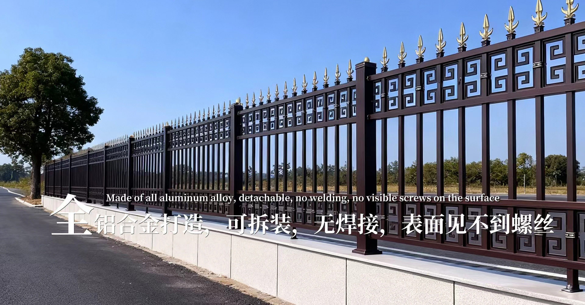 这是新兴的一个铁艺围栏类别,其本身采用的是全铝合金打造,可拆装,无焊接,表面见不到螺丝。连接紧凑,无松散脱落现象。包装、运输、安装方便。围栏请便容易加工、运输费用经济。铝合金材可以抵御较大的拉力和冲击力,同时拥有更加良好的柔韧性。表面富有坚硬的铝氧化膜,在经过尤其和阳极氧化等表面处理使围栏具有强的耐腐蚀性。